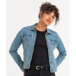 Cotton/elastane blended denim jacket with classic denim styling. 4 pocket design, shank button placket, button cuffs and adjustable back. Fashion fit. Stretch denim. 4 pocket styling. Classic light and dark blue washes. Contrast stitching. Classic denim jacket panelling. Button cuff detail. Inside back neck hanger loop.